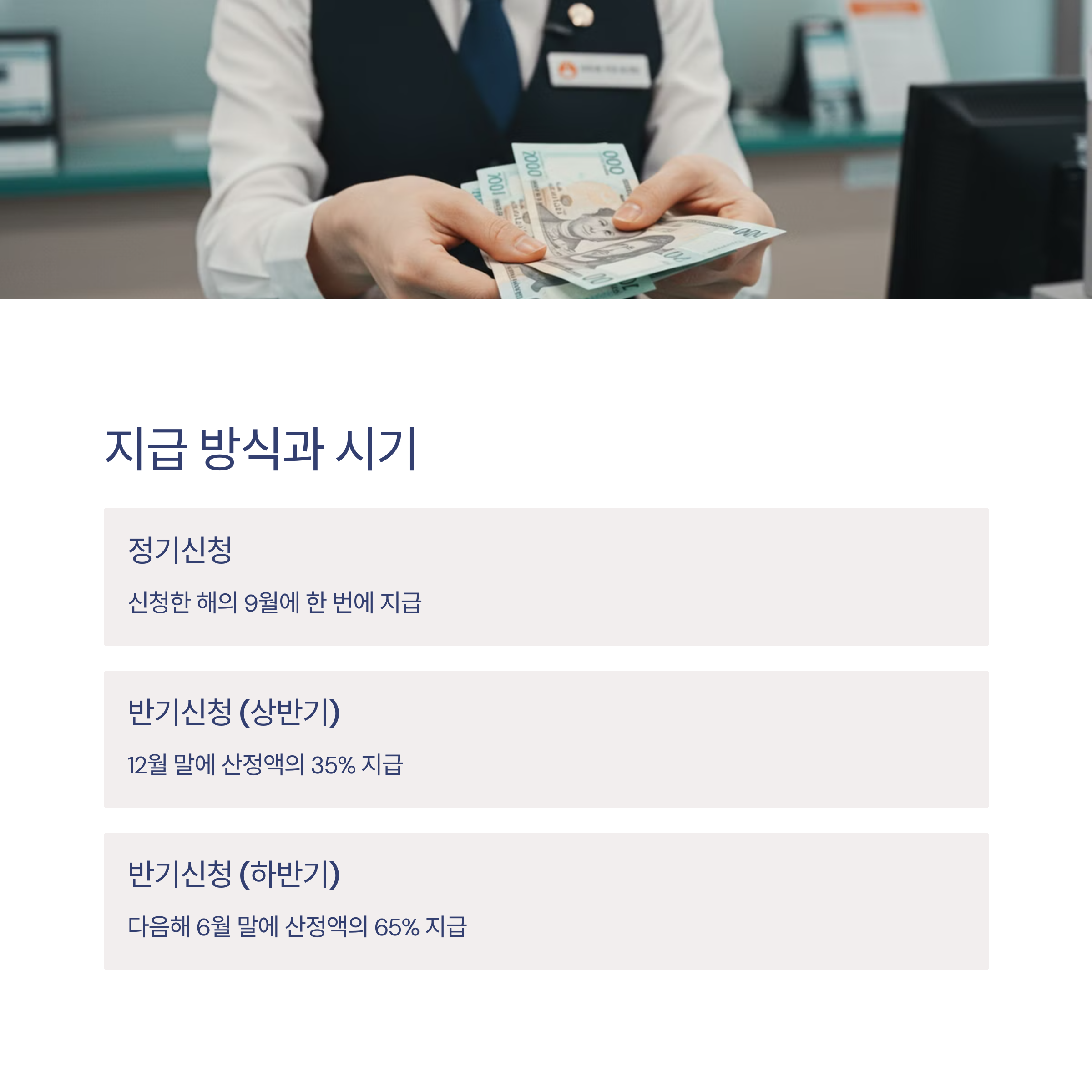 - 반기신청은 상반기에 35%, 하반기에 65%로 나누어 지급하는데, 이는 소득 변동에 따른 환수 가능성을 고려한 것입니다.