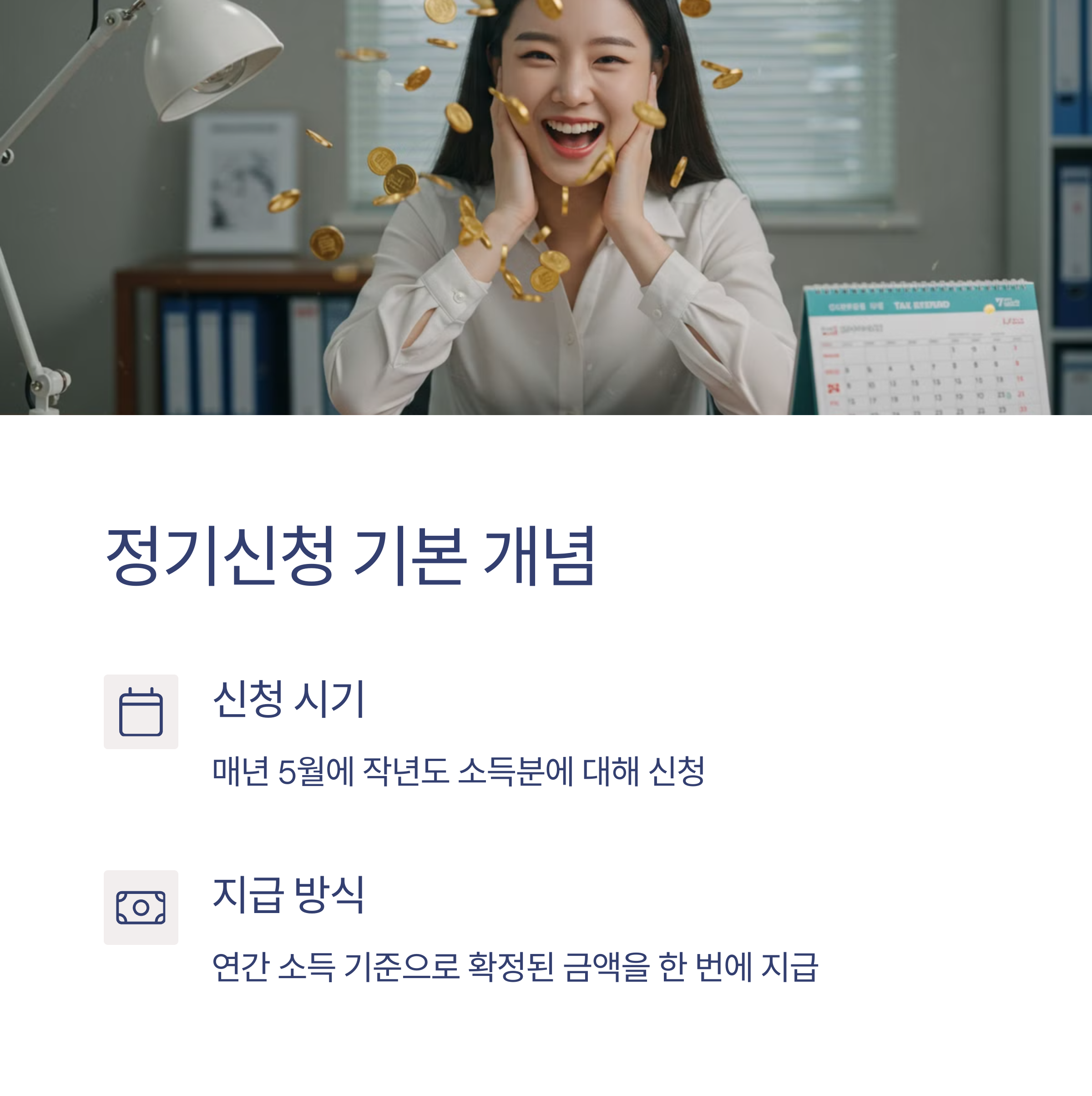 • 소득 변동이 심한 경우에는 연말 정산 후 환급 가능성이 있으므로 정기신청이 안정적입니다.