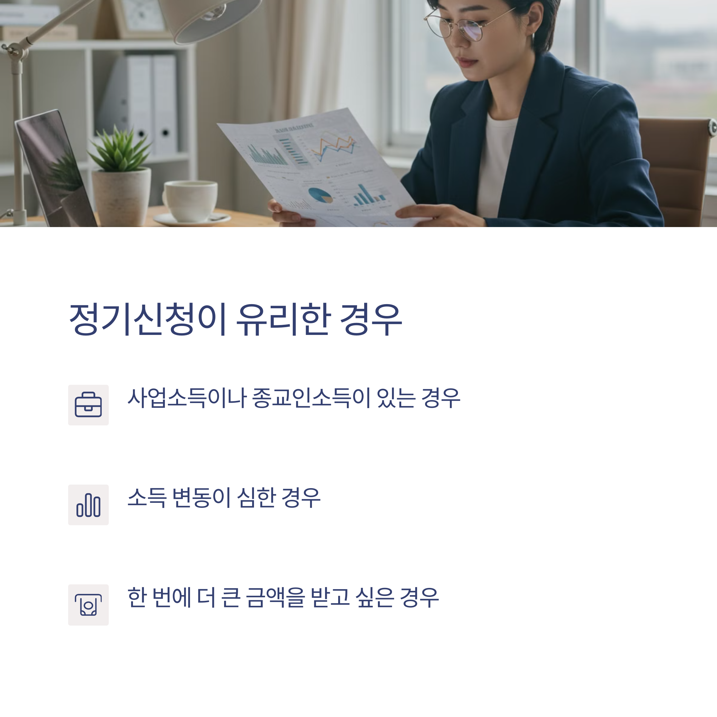 - 연말까지 소득 변동이 클 것으로 예상되는 경우에도 정기신청이 유리합니다.