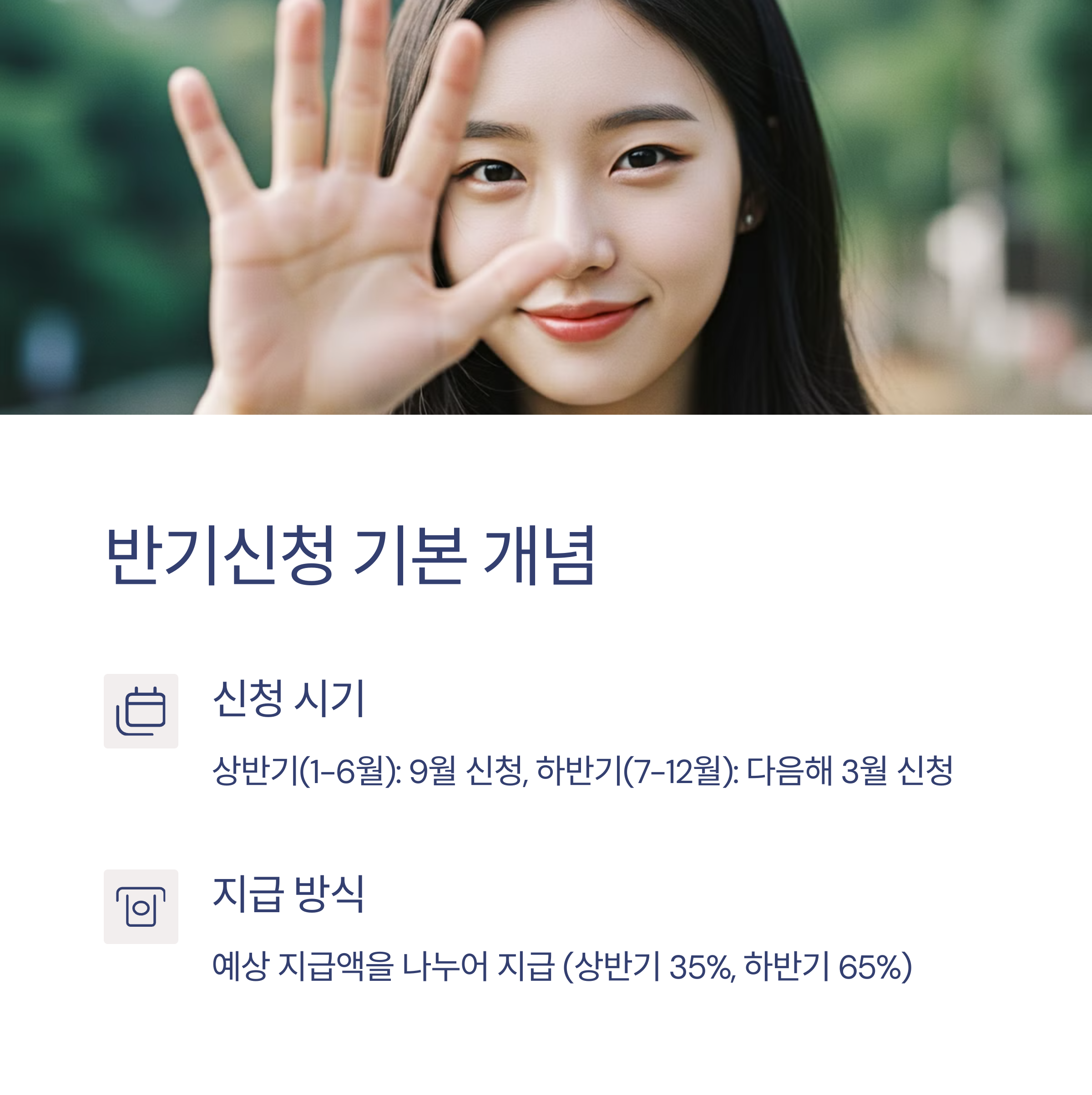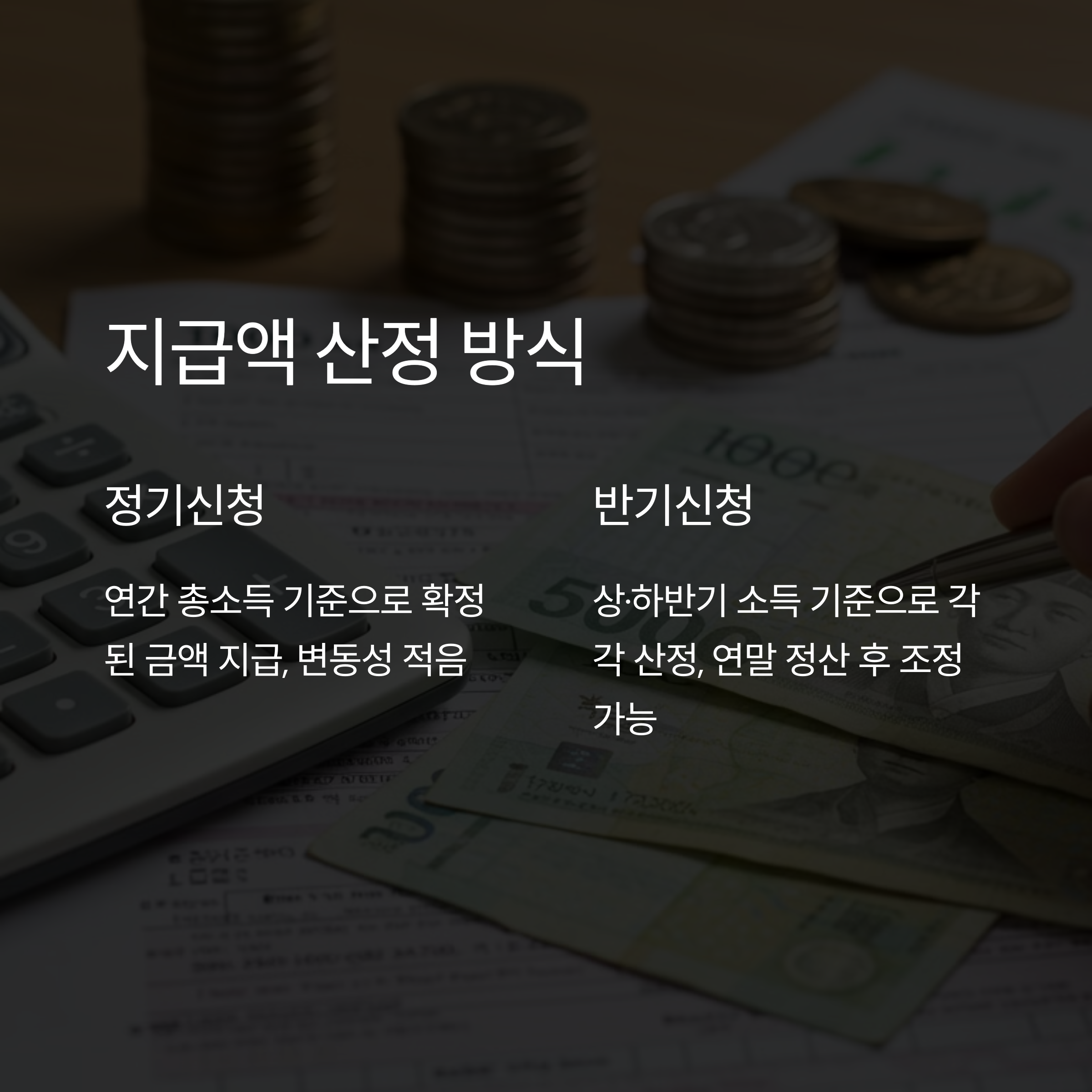 • 반기신청은 상반기에 35%, 하반기에 65%로 나누어 지급하는데, 이는 소득 변동에 따른 환수 가능성을 고려한 것입니다.