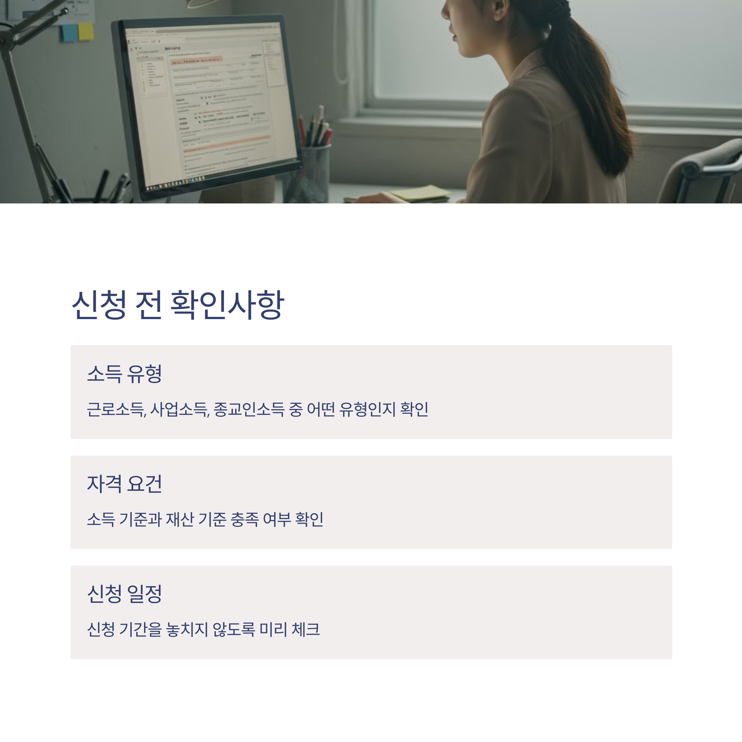 • 신청 자격 요건인 소득 기준과 재산 기준을 충족하는지 확인하세요.