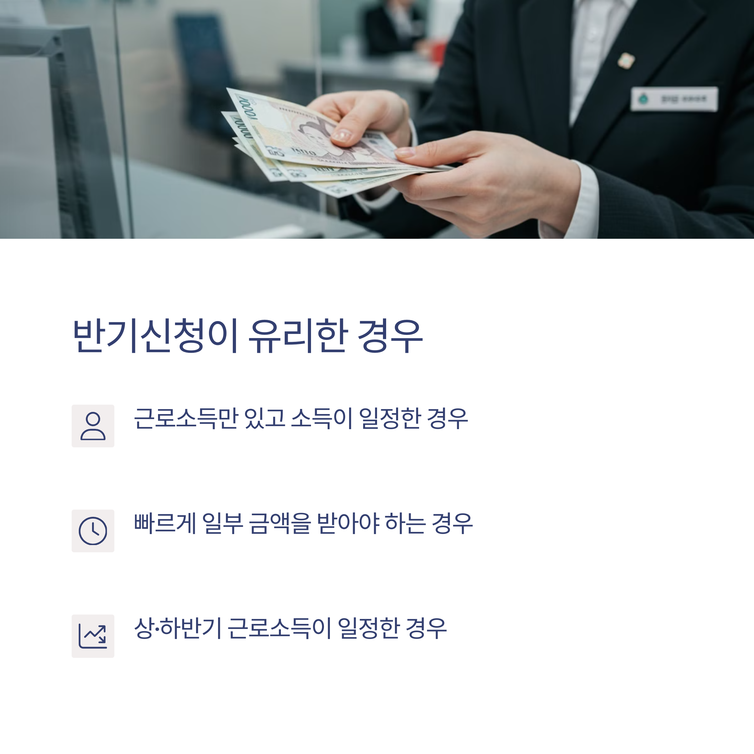 - 근로소득만 있고 소득이 일정한 경우, 특히 연말 정산 시 큰 변동이 없을 것으로 예상된다면 반기신청을 고려해보세요.