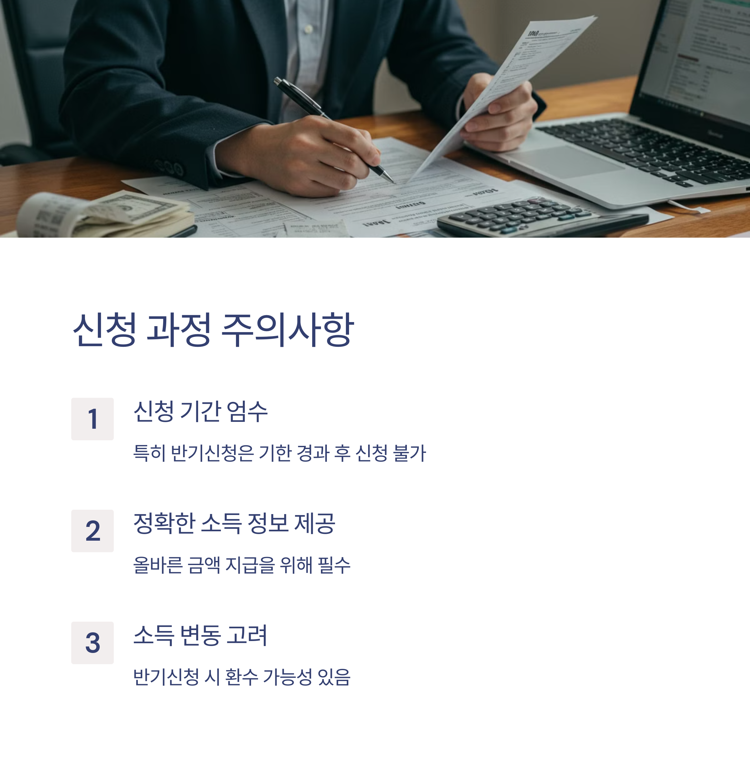 - 반기신청의 경우 소득 변동에 따른 환수 가능성을 고려해야 합니다.