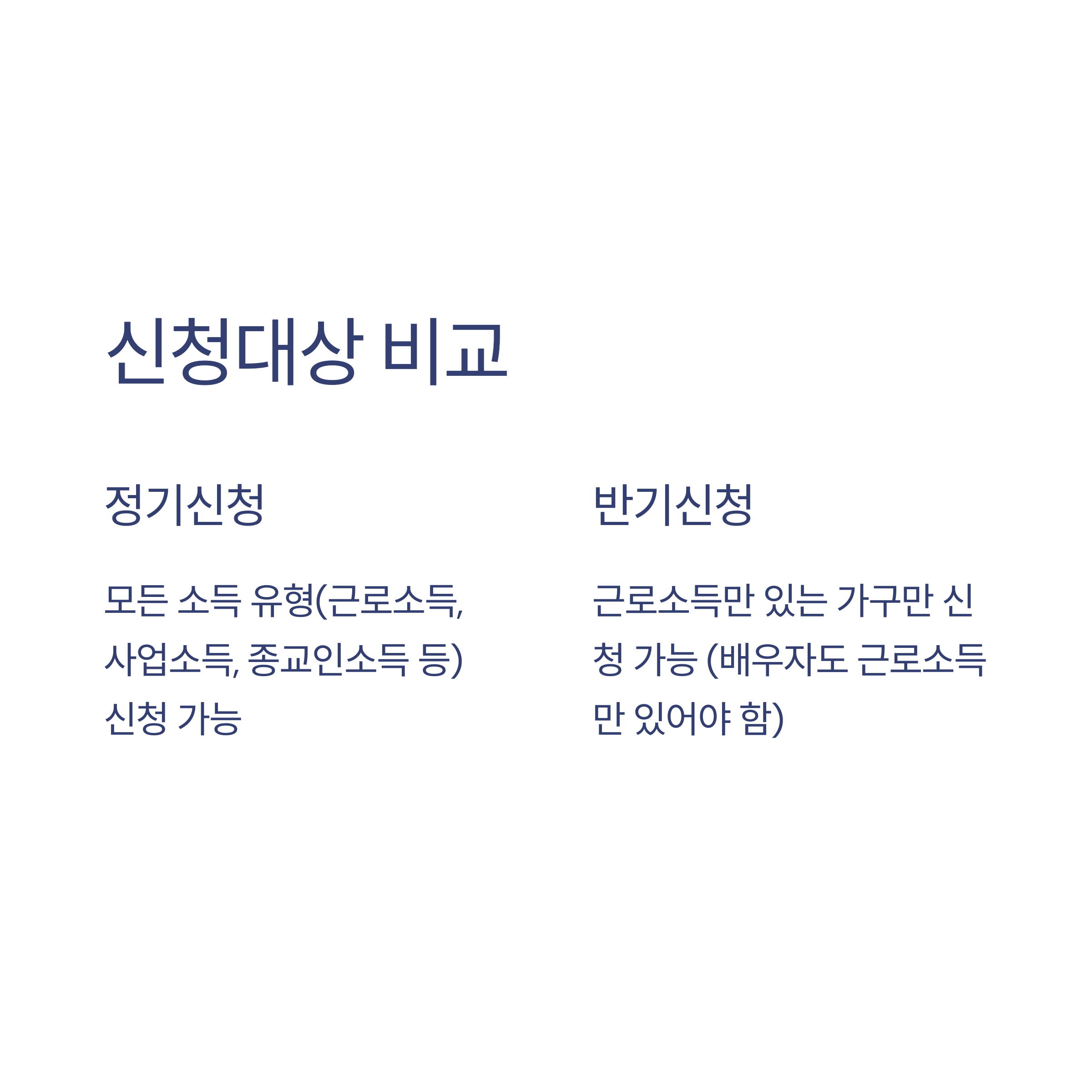• 사업소득이 있거나 종교인소득이 있는 경우에는 반기신청이 불가능하므로 정기신청만 가능합니다.