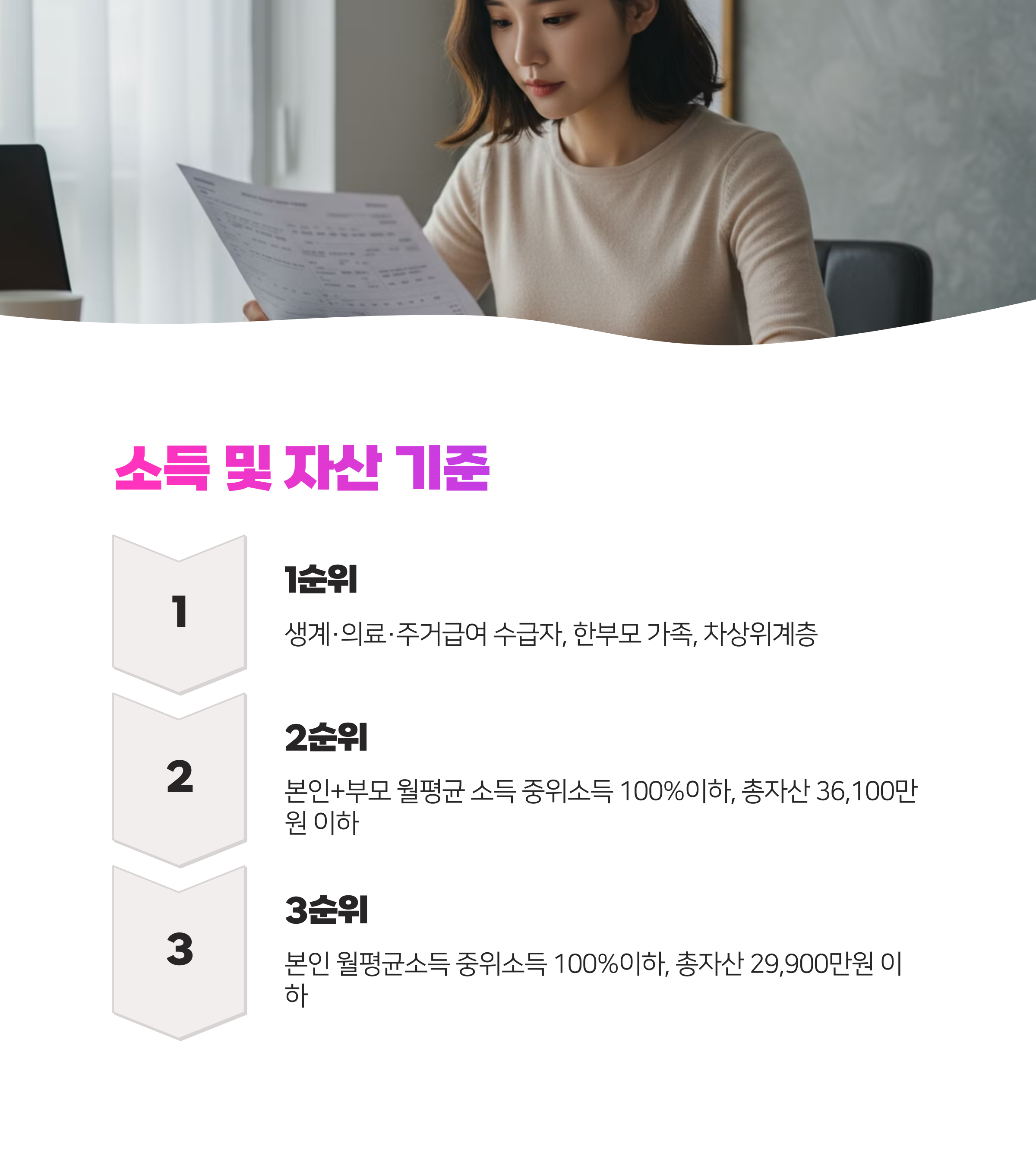 - 3순위: 본인 월평균소득이 중위소득 100%이하, 총자산 29,900만원 이하